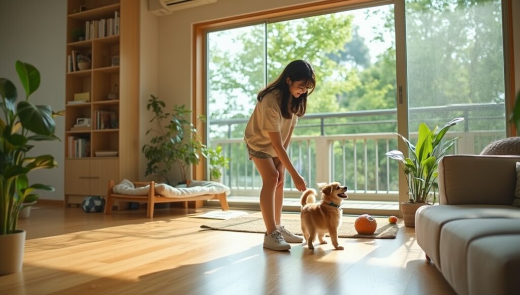 まず、ペットと暮らすための必須設備として、床材の性質が最も重要なポイントとなります。フローリングの場合は傷つきにくい材質を選び、滑り止め加工があるものが理想的でしょう。特に京都は夏場の蒸し暑さが厳しいため、清潔さを保ちやすい床材を選ぶことをおすすめします。